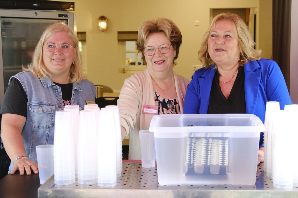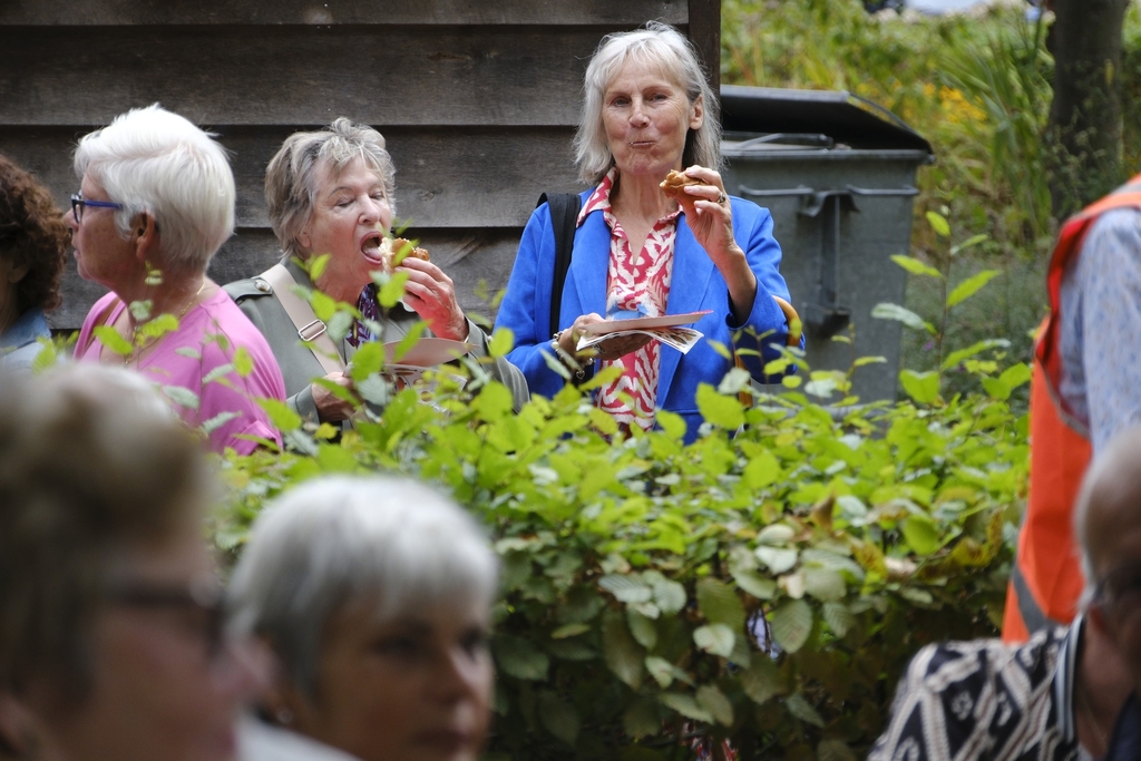 Hoewel tegen zessen de lucht betrok, bleef het droog. En korte tijd later scheen het prille avondzonnetje nog een beetje, toen zo’n 50 voornamelijk rolstoelers en een enkele scootmobieler arriveerden bij de muziekkoepel. Zij en hun duwers deden mee aan de Rolstoeldriedaagse. Vanuit een busje van de Zorgfederatie kregen ze drinken, fruit, een plakje worst of een lekker stukje kaas. En natuurlijk genoten ze van het spontane optreden van de dames van Ontroerend Goed, die het prima naar hun zin hadden en naderhand lieten weten dat ook zij zeer hadden genoten van hun optreden en vooral van hun dankbare publiek.