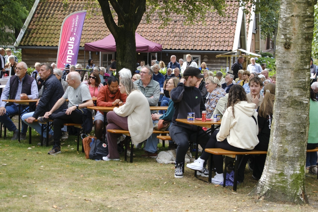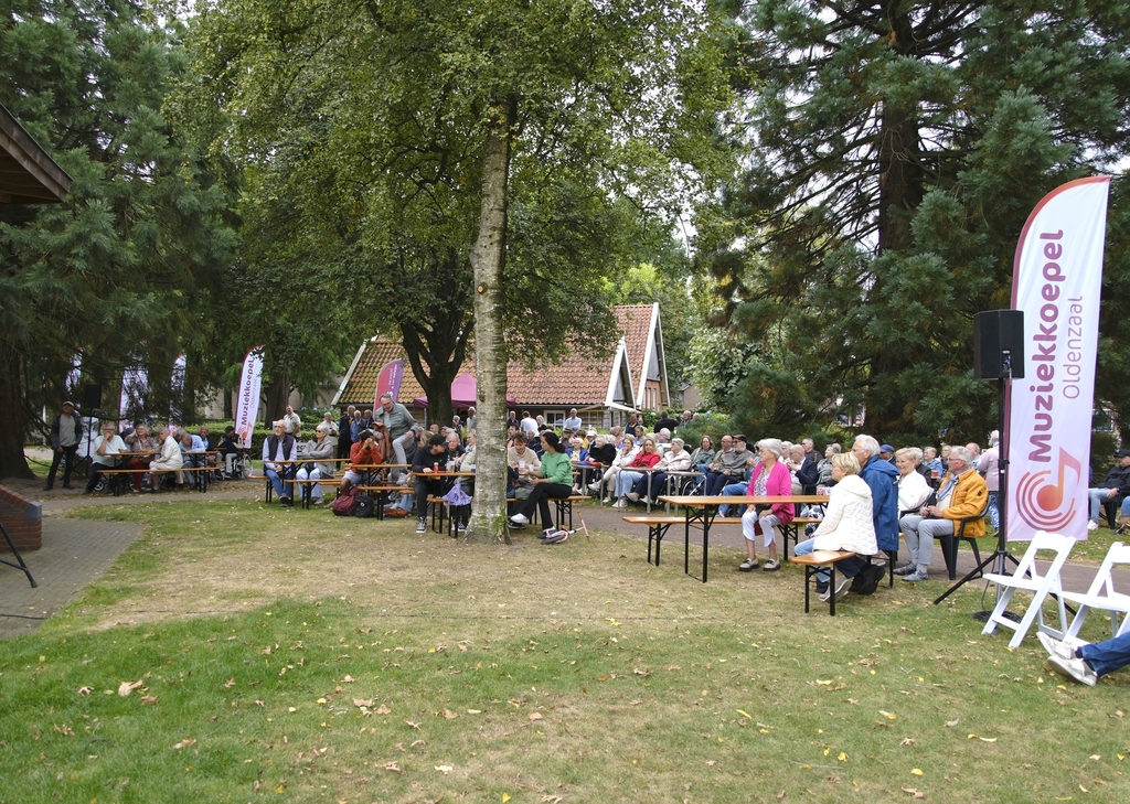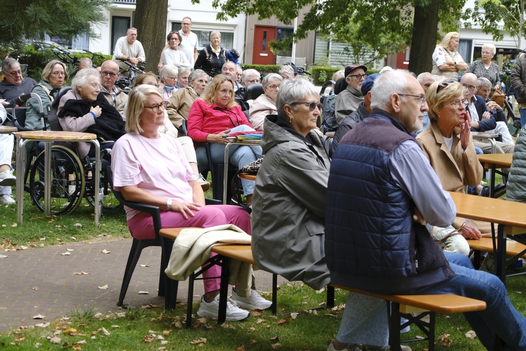 ‘Dit is ’n heel mooi bandje.’ Rita Tanke-Siemerink (Rita van ’n Elsmöss) liet het zich zondagmiddag 31 augustus 2025 bij de muziekkoepel in Park Stakenkamp een paar keer ontvallen. Rita, gekend en bekend bij heel veel Berghuizenaren, zat naast een andere wijkbewoonster Els Kamphuis in een comfortabel kuipstoeltje te genieten in de schaduw van een van de machtige bomen in het park.