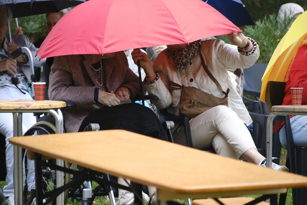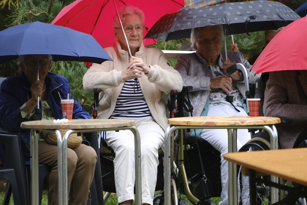 Een redelijke bui liet het publiek even de paraplus opsteken. Bewondering was er voor de gasten van de Zorgfederatie Oldenzaal, waaronder een 103-jarige. Zij gaven helemaal niets om het buitje en lieten zich hun kopje koffie en broodje knakworst prima smaken.