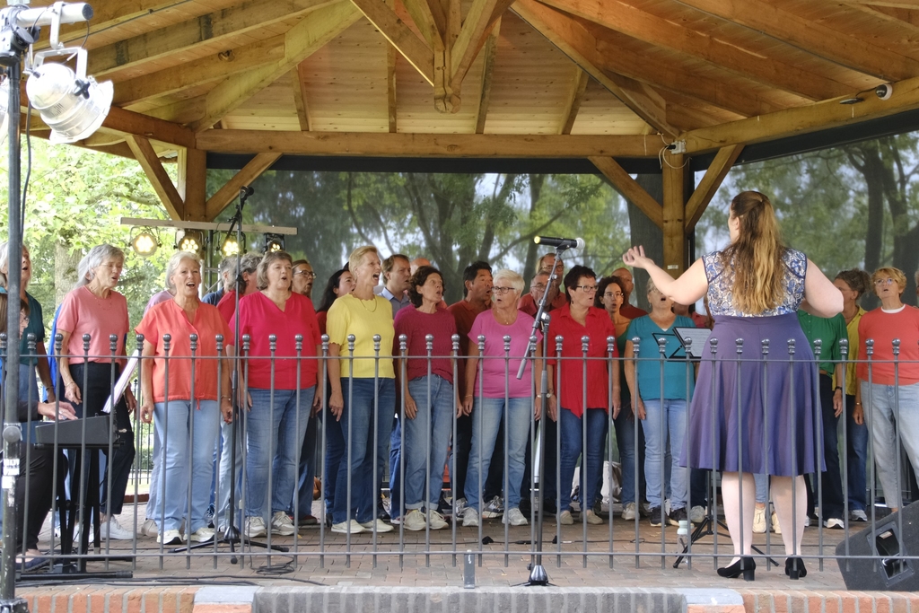 Wat een ensemble van elementen dinsdagavond 30 mei 2023 in Park Stakenkamp. Het donkerrood en lichtgroen van de bijzondere bomen. Daaronder de muziekkoepel met een zeven vrouwen sterk koor, dat door de schitterende repertoirekeuze enorme verlangens naar de tijd van de Arbeidsvitaminen en de eerste televisie wist los te weken.