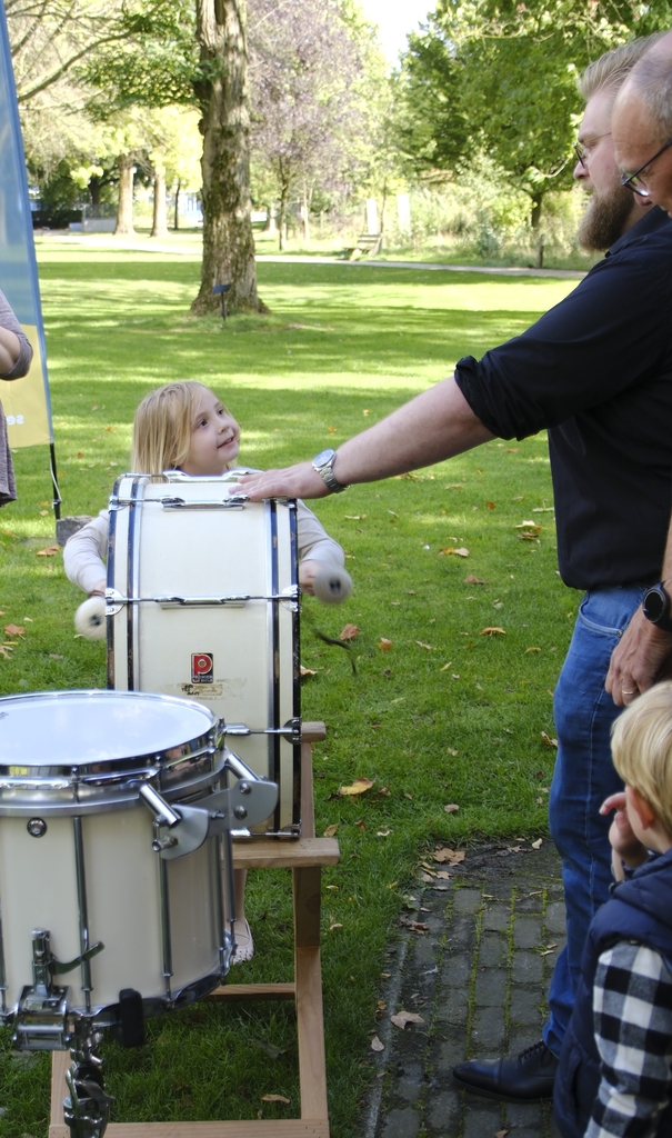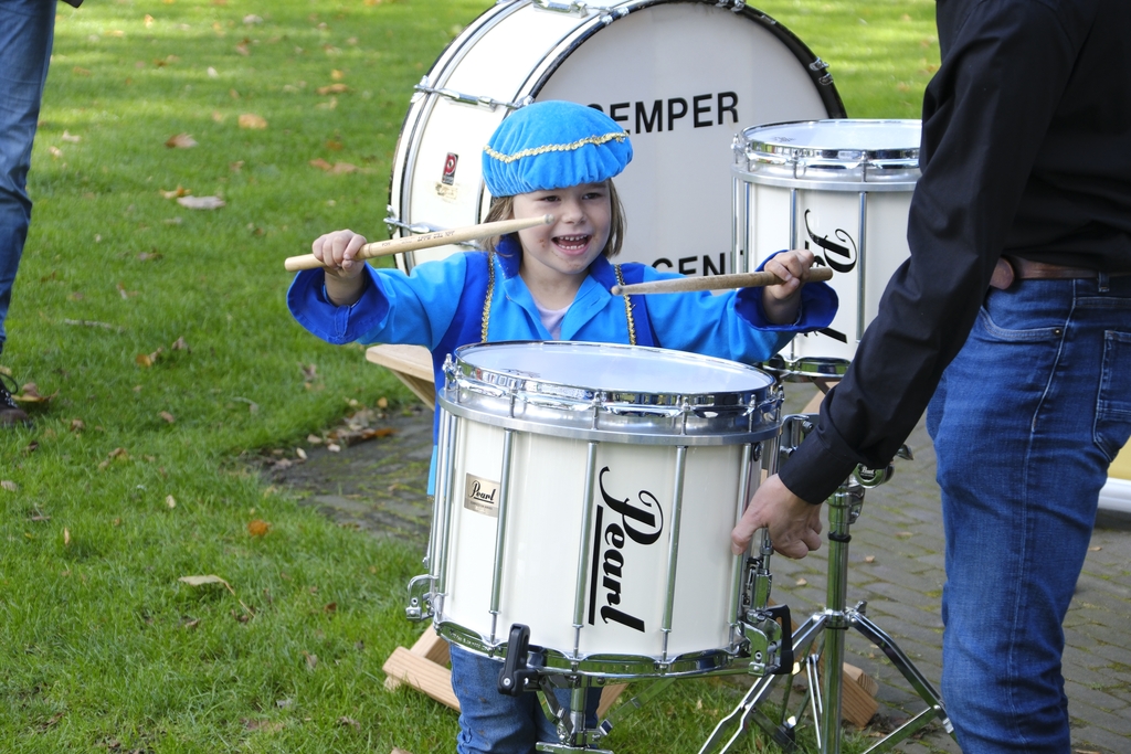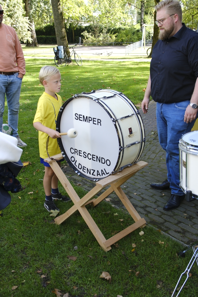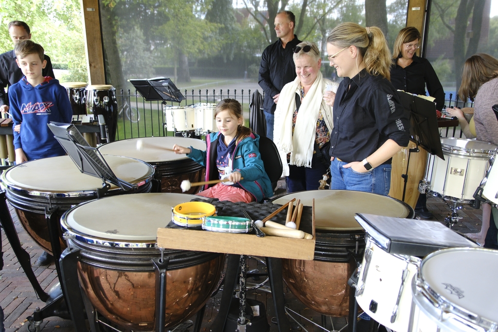 Wat spannend! Met opa en oma op een flinke trommel slaan. Deze kleuter genoot er zondagmiddag 17 september 2023 zichtbaar van, evenals iets oudere kinderen en zelfs vaders en moeders, die wel een instrument wilden uitproberen.